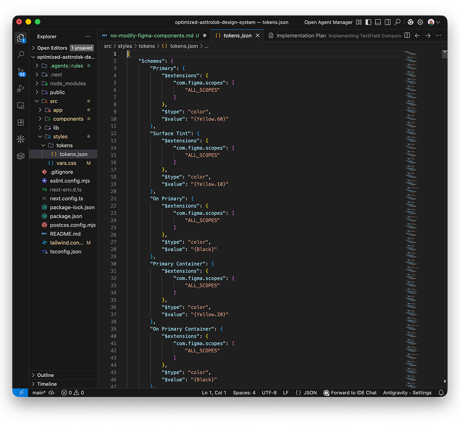 Copy tokens.json file into /styles/tokens/folder. Give prompt to Google Antigravity Agent "Analyze the tokens.json file. Update the tailwind.config.ts to extend the theme with these specific values for colors, font sizes, and spacing. Create a vars.css file in /styles that maps these tokens t o CSS variables for maximum flexibility"