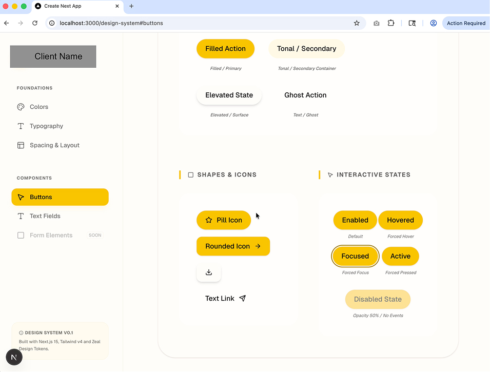 "Build a React component for a 'Primary Button' in /components/ui/Button.tsx. Use Next.js 14+ standards and Tailwind CSS. Reference the theme values we just added to the tailwind config. Ensure it is accessible (ARIA labels), supports multiple states (hover, active, disabled), and is responsive. Run a local dev server and use the integrated browser to verify the visual fidelity of the generated components against the Figma design. Create a Storybook-style Preview' page at /design-system to showcase all components."
