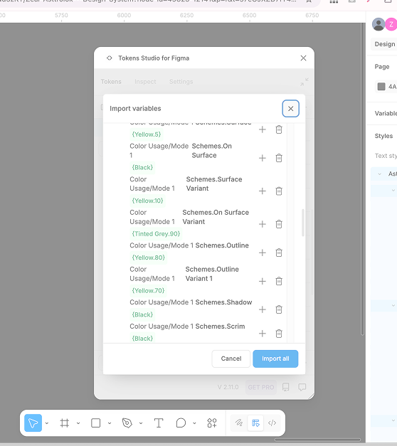 Run free Figma Plugin 'Tokens Studio for Figma' to Export Styles and Colors into tokens.json file
