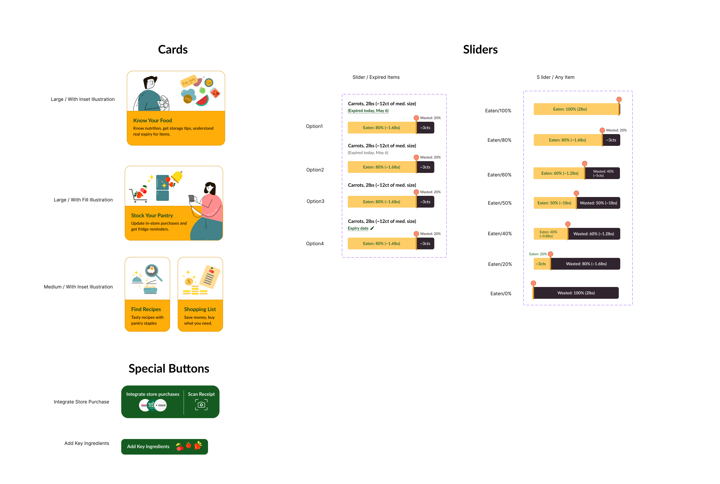 I wanted the app to have a casual friendly vibe and visually echo the message about food and sustainability. With this in mind I created below pattern libraries to appealing userâs visceral & emotional side.