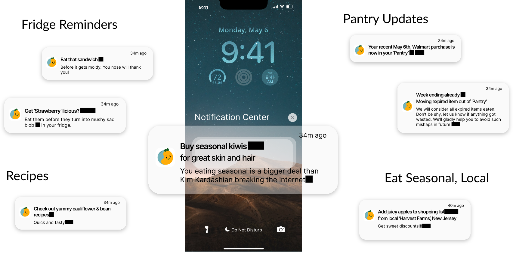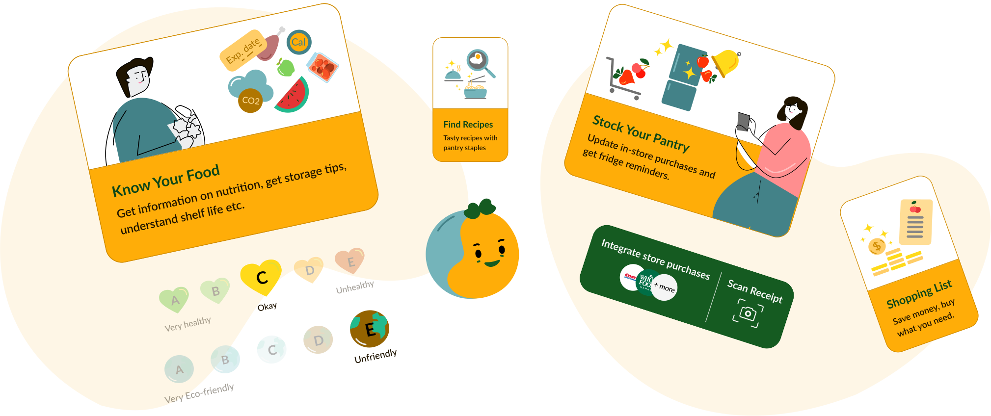 To help reduce food waste, I designed features like âFridge Items Remindersâ, âFinding Relevant Recipesâ, âStorage Tipsâ. To raise awareness about health and climate impact of food, I introduced features like Nutri-scores, Eco-scores.