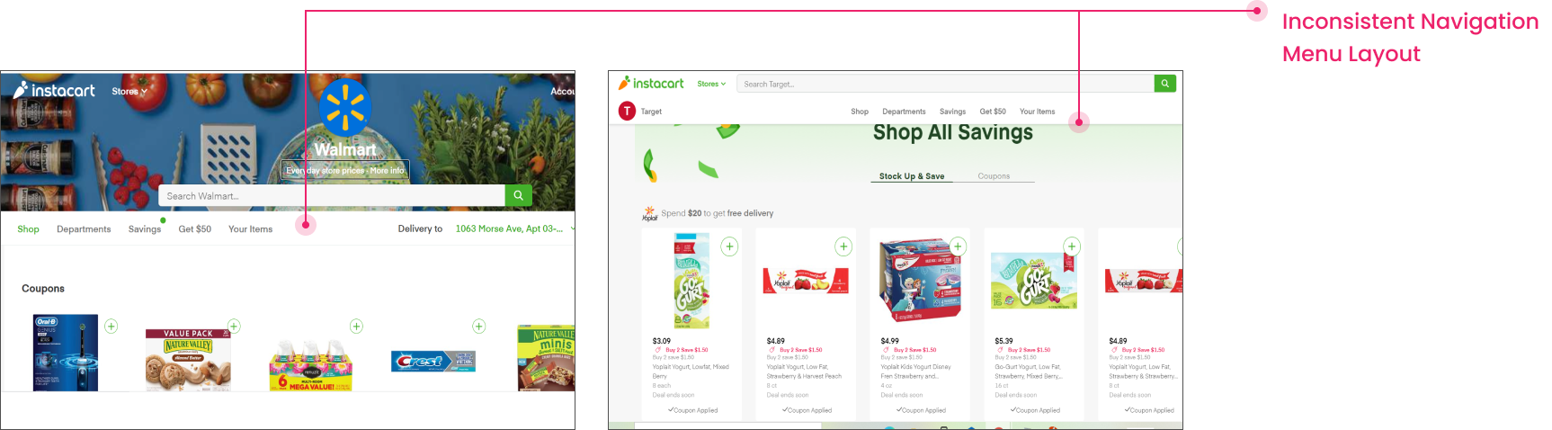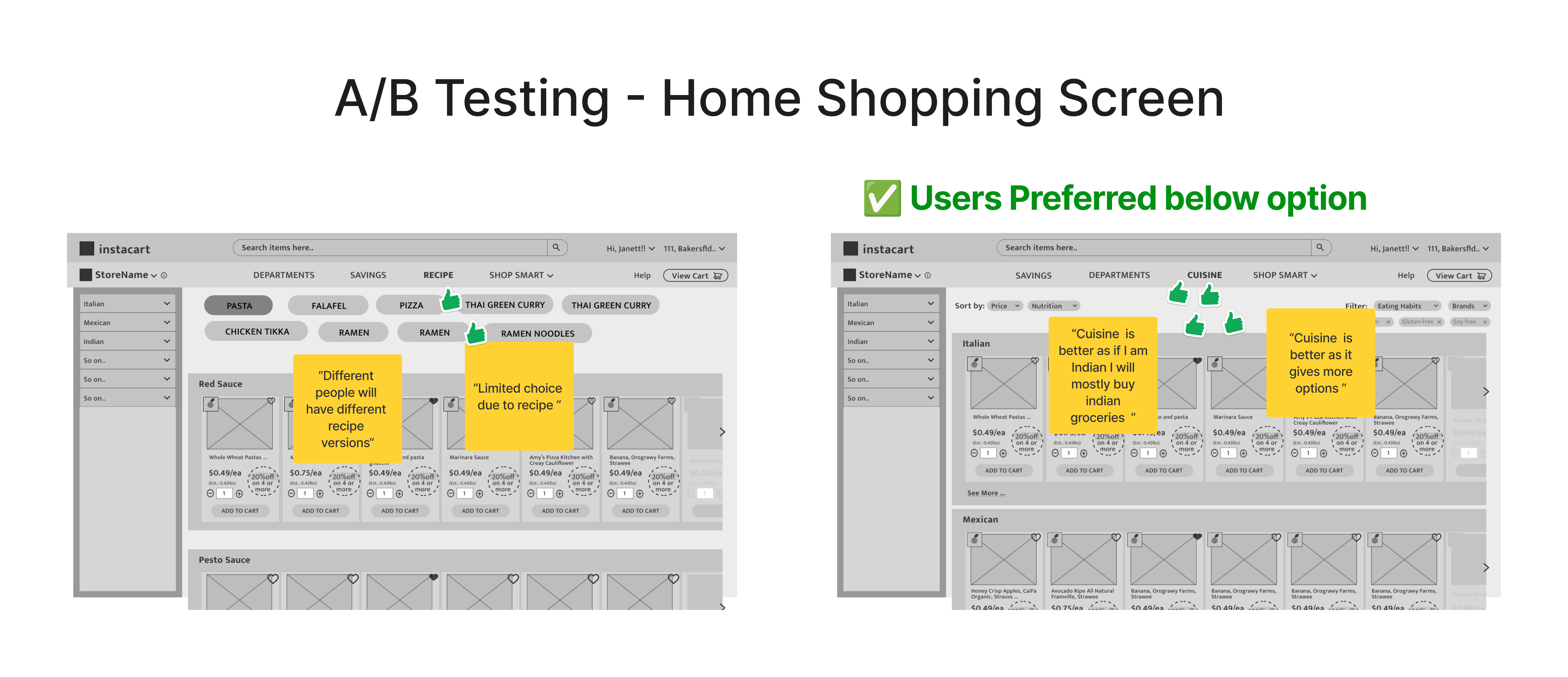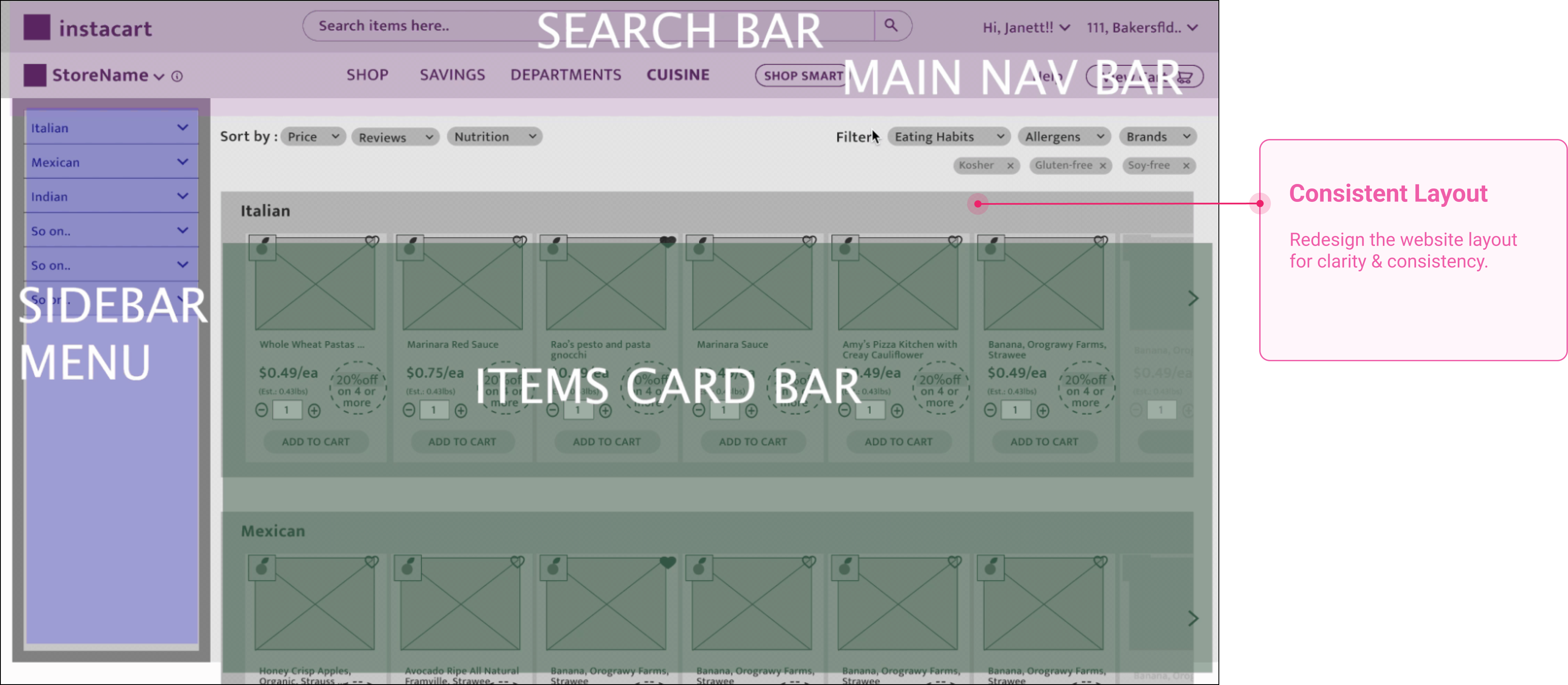 Based on the research insights, I found the current state of Instacart website product browsing page is confusing and non-intuitive, Key User Painpoints,